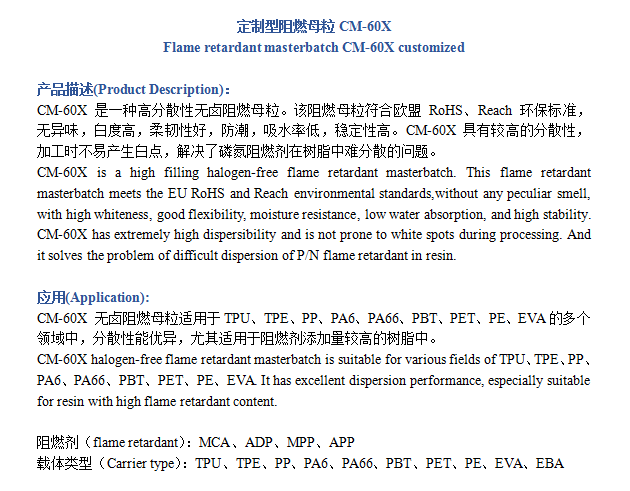 上一條產品: 聚酯TPU專用阻燃母粒CM-60C